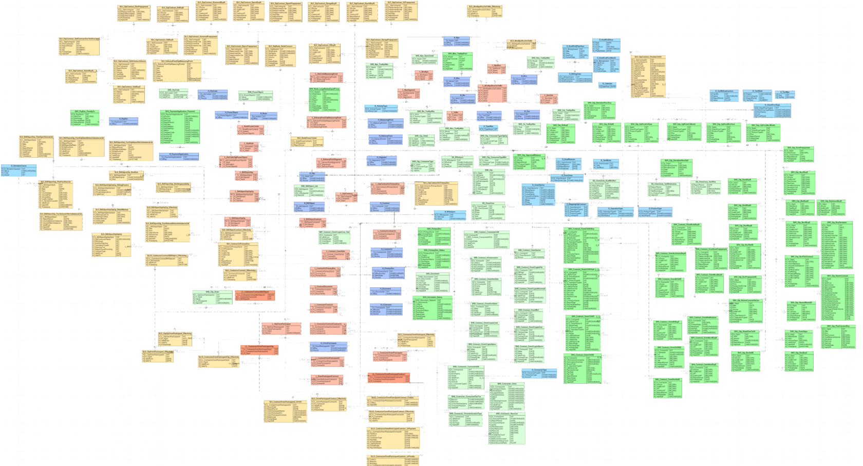 - Ссылки (Links) — красный. Таблицы, которые описывают связи между хабами использует светло-красный цвет и префикс L_, для связей между таблицами ссылок используется темно-красный цвет и префикс LL_.