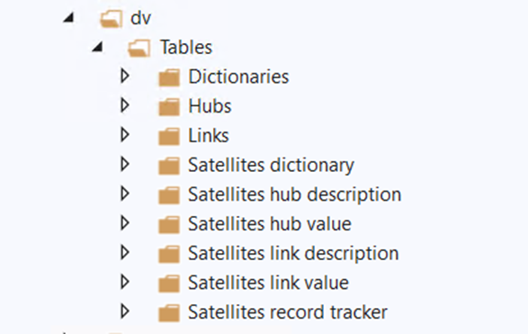 На схеме сателлиты хабов и справочников выделены зеленым и имеют префиксы SD_ (Satellite Dictionary), SHD_ (Satellite hub description), SHV_ (Satellite hub value).